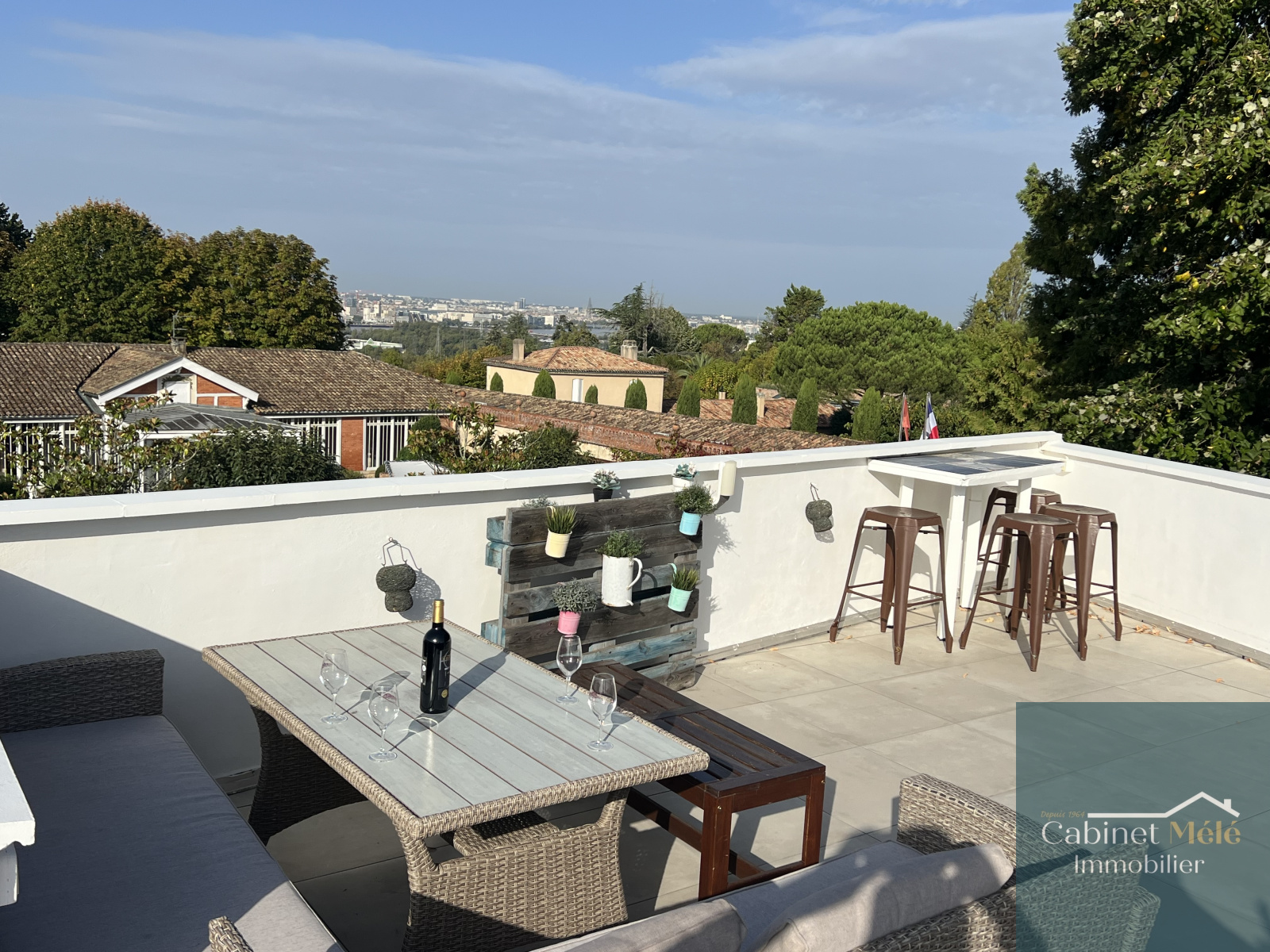 Nous vous proposons ce bien immobilier atypique de 145 m² habitables situé en plein cœur de Bouliac. Il se compose de deux appartements distincts de type 3 chacun, l'un avec sa terrasse de 60 m² et sa piscine, l'autre avec son toit terrasse de 30 m² et sa vue magnifique à 360 degrés.