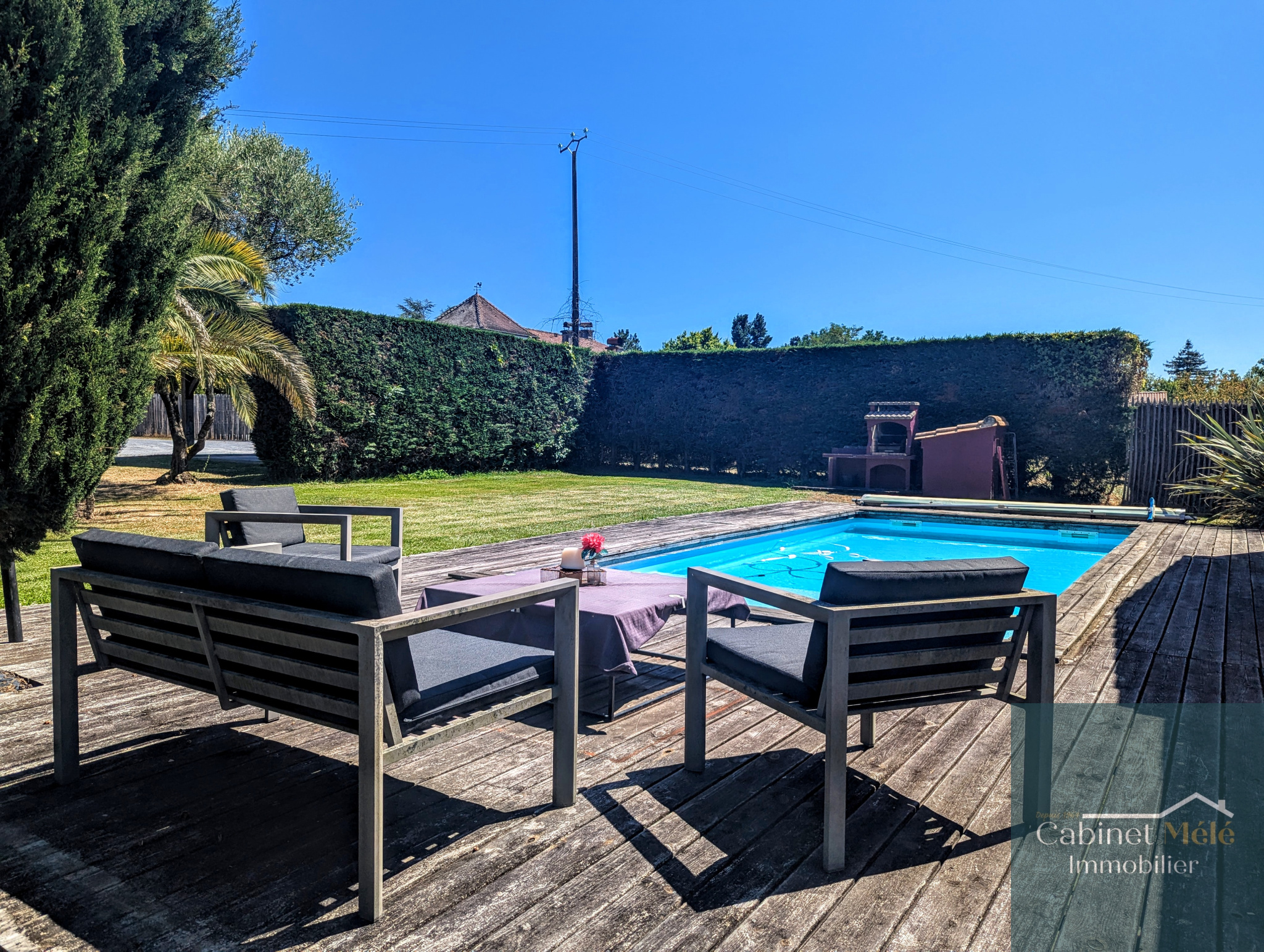 Le terrain de 1328m² est clôturé et comprend une piscine 4x8 au chlore.